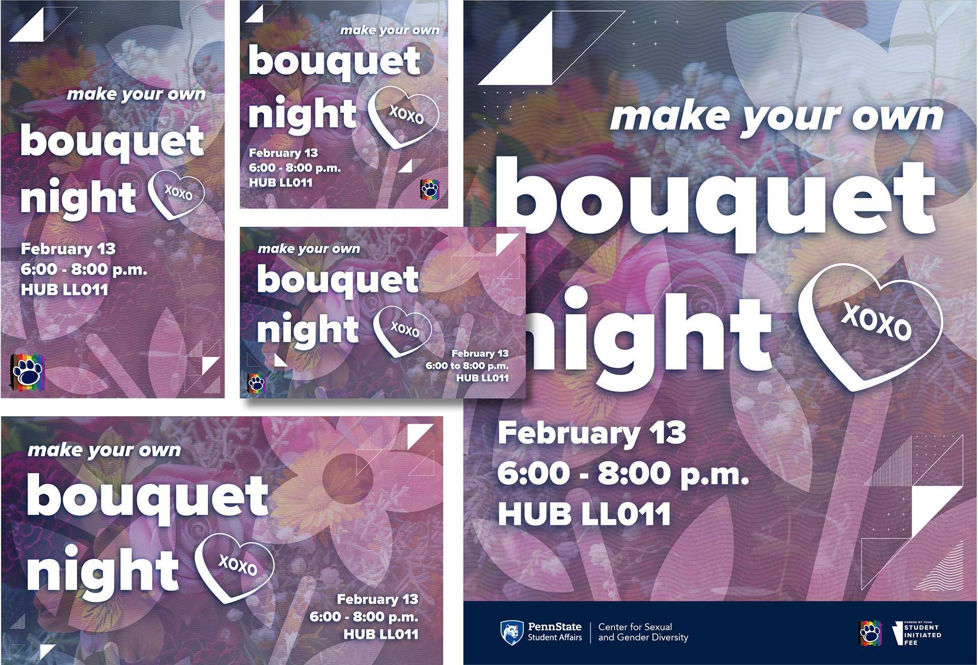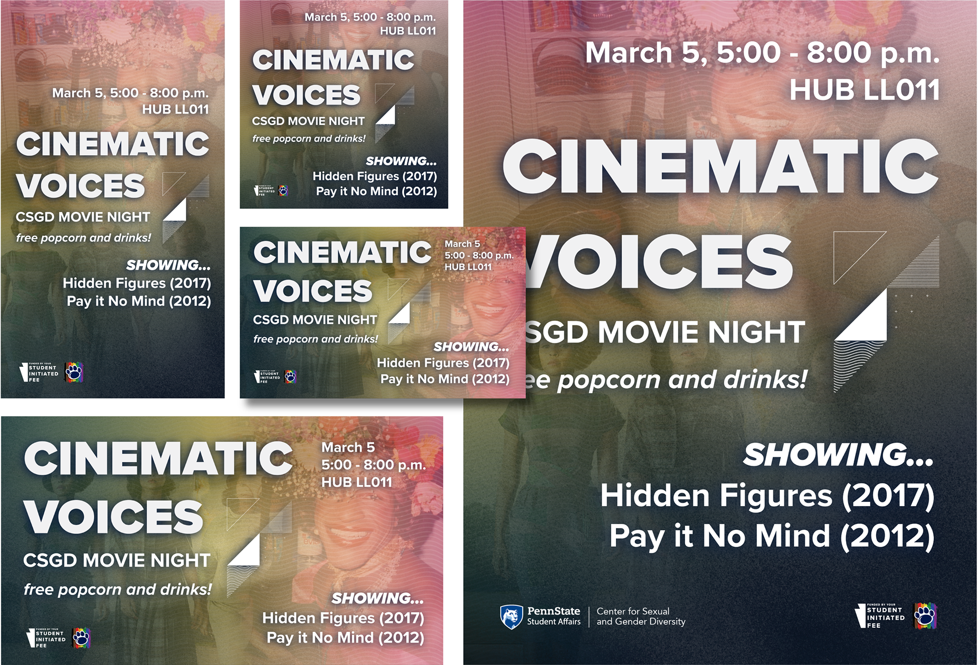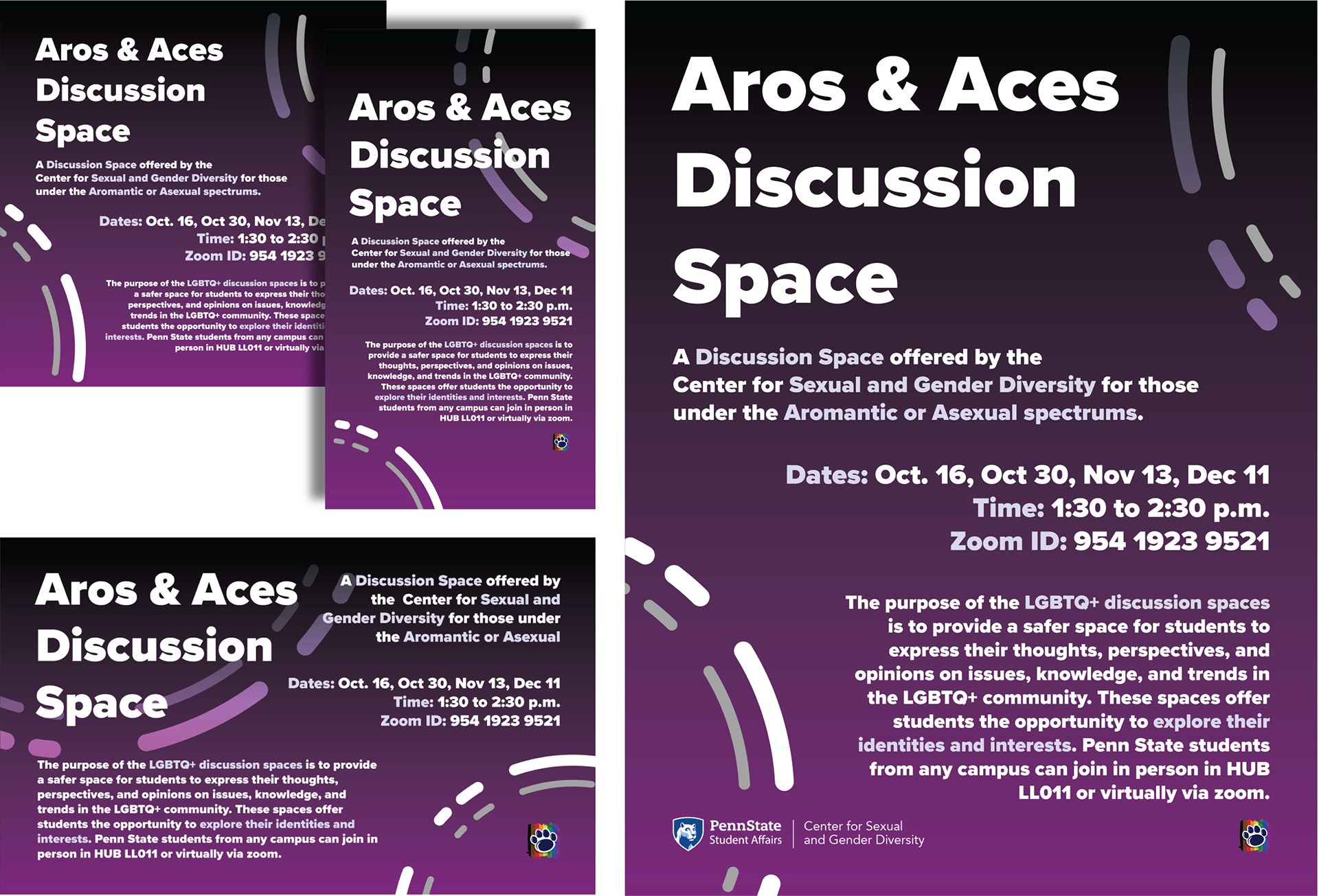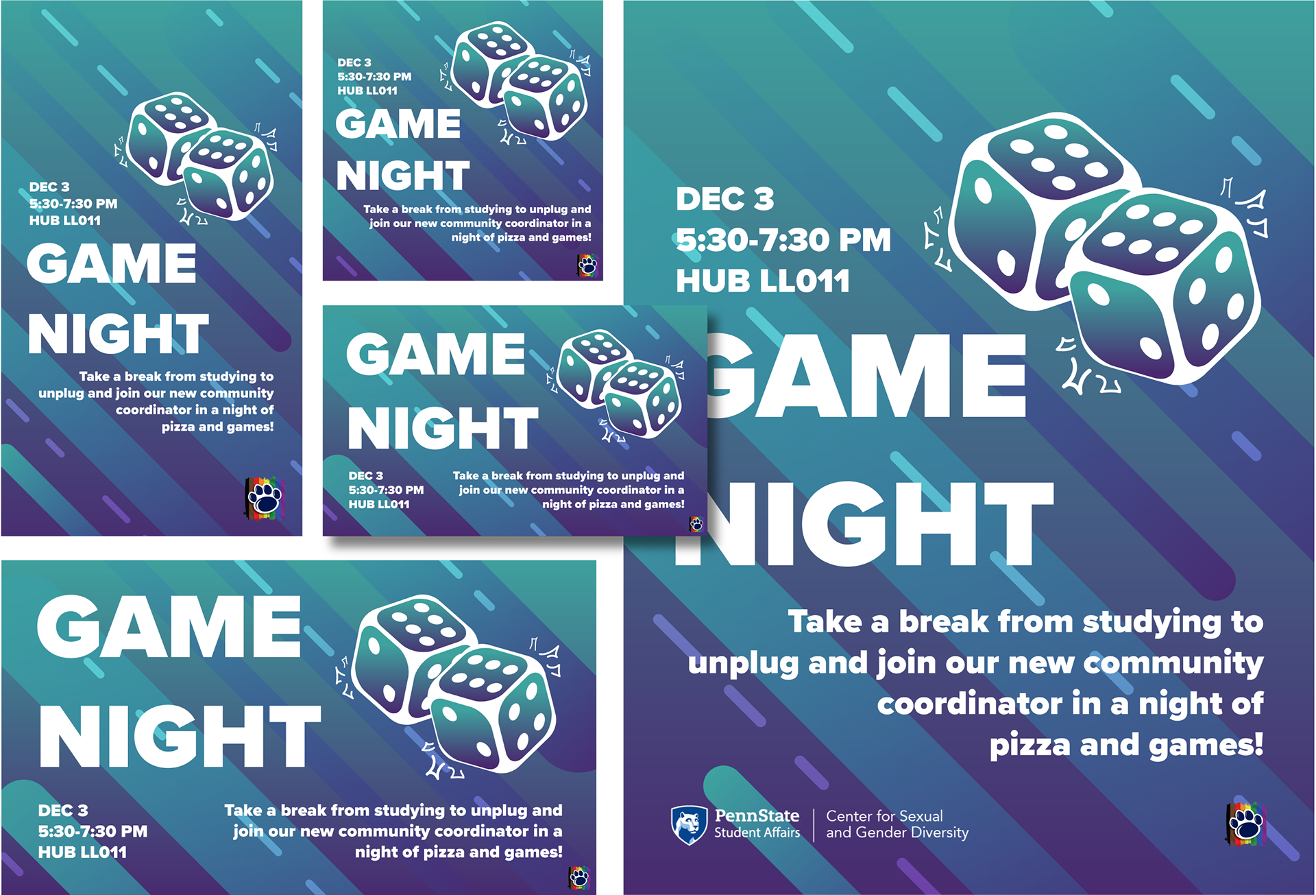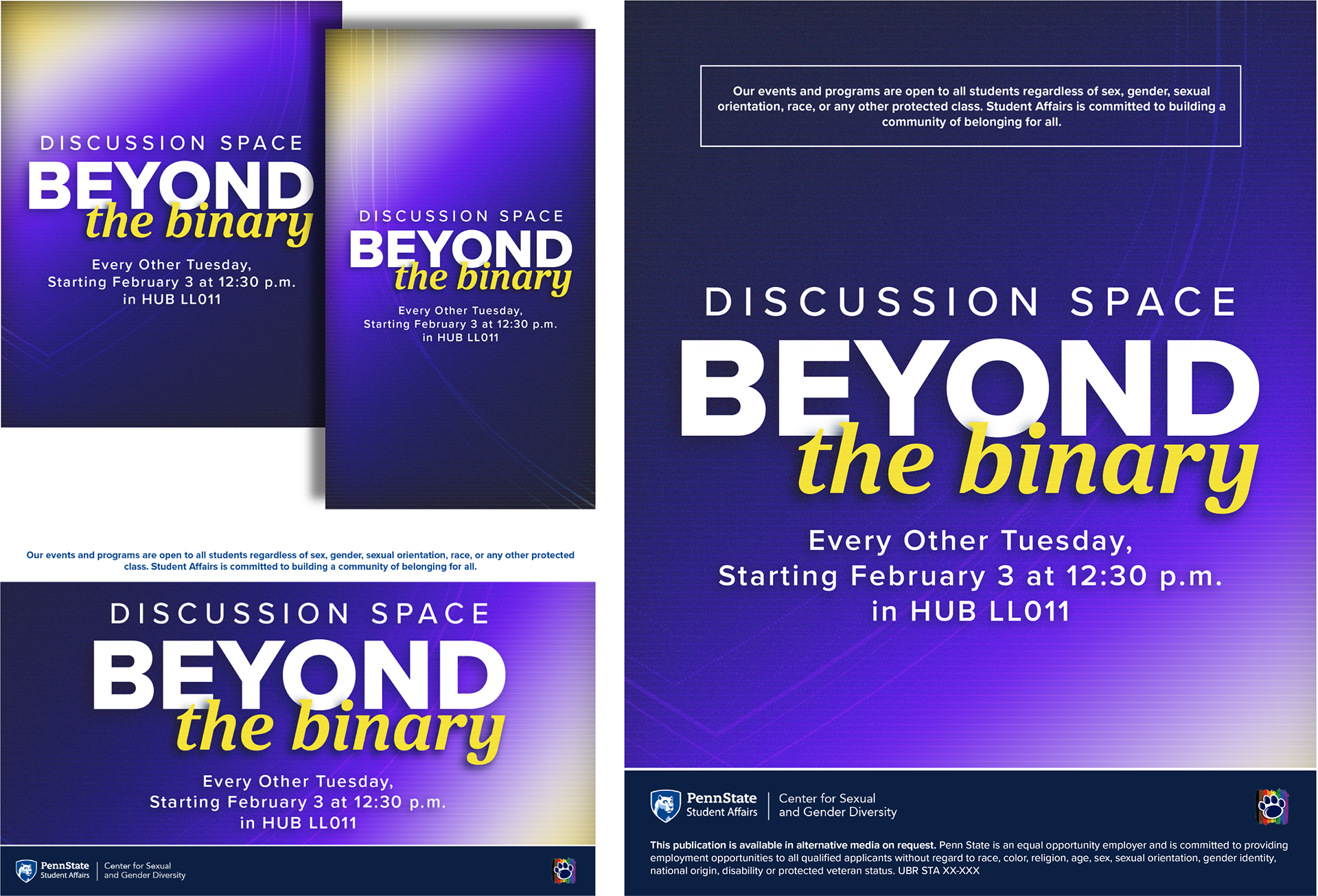Select promotional collateral for the CSGD’s Late Nights, student-led evening events designed and hosted by programming staff, and Discussion Spaces, recurring discussions meant to provide students with a safe space to explore their identities, interests, and perspectives.