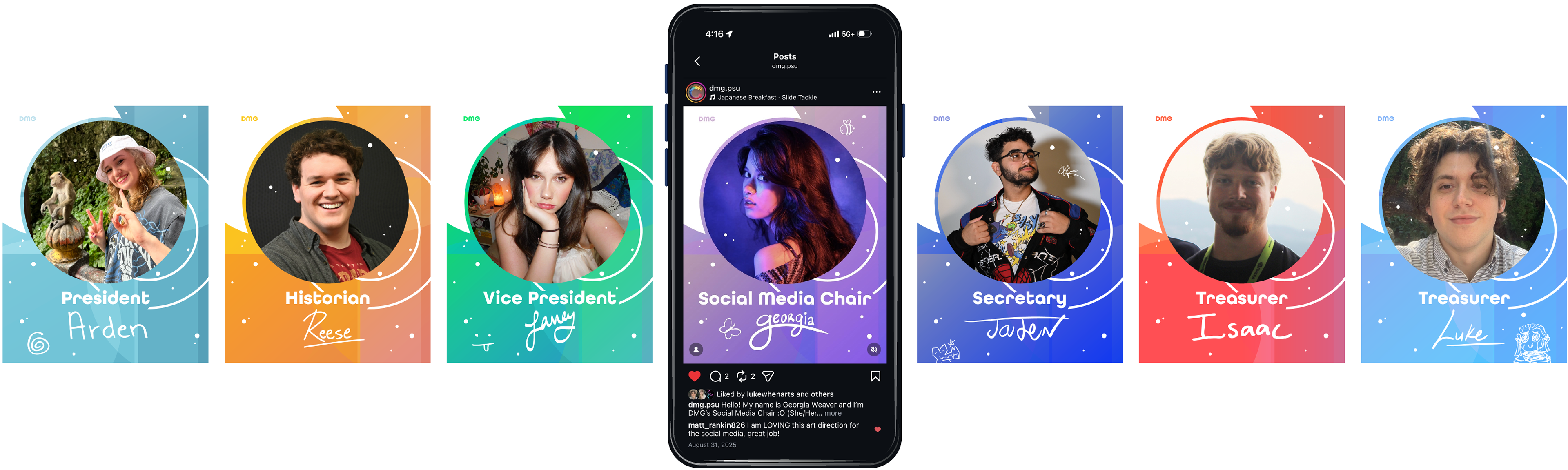 As the elected Social Media Chair (2025-2026), I revised our club's brand! I currently create weekly graphics and write copy for each event - feel free to check out the Instagram account I run here!